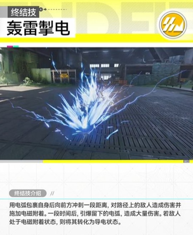 用电弧包裹自身后向前方冲刺一段距离,对路径上的敌人造成伤害并施加电磁附着。一段时间后,引爆留下的电弧,造成大量伤害。若敌人处于电磁附着状态,则将其转化为导电状态。