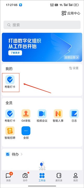 进入考勤打卡后,点击屏幕中间的打卡即可完成考勤打卡