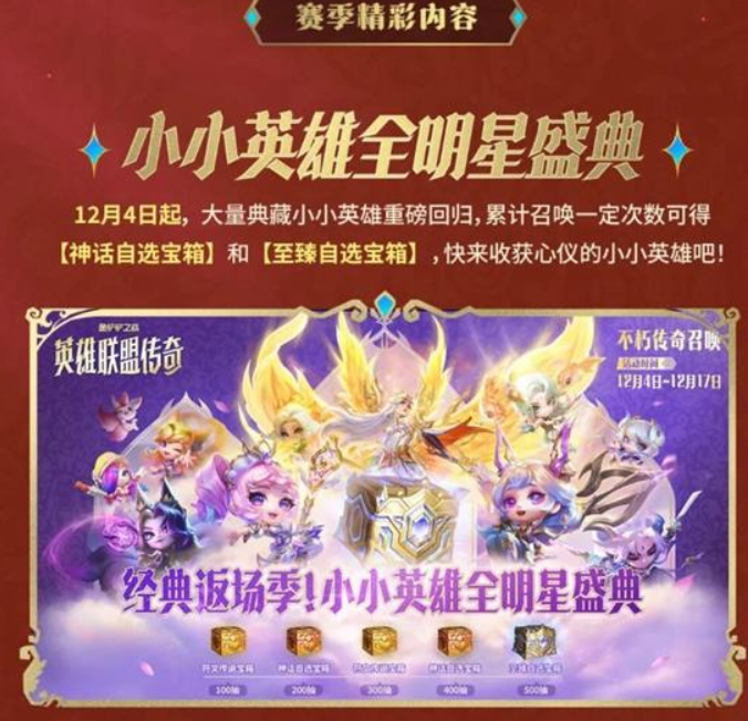 从12月4日起,大量典藏小小英雄将重磅回归,参与【不朽传奇召唤】活动。累计召唤达到一定次数,玩家将有机会获得【神话自选宝箱】和【至臻自选宝箱】,让你的小小英雄队伍更加强大和多样化。