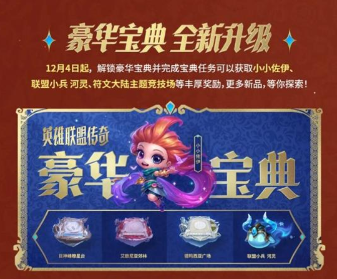 豪华宝典也将在新版本中迎来全新升级。从12月4日起,解锁豪华宝典并完成宝典任务,玩家可以获取小小佐伊、联盟小兵河灵、符文大陆主题竞技场等丰厚奖励,以及更多新品。