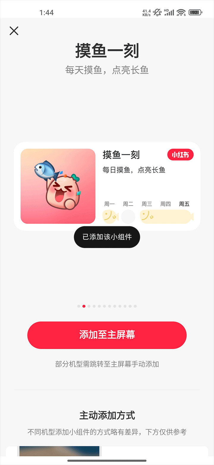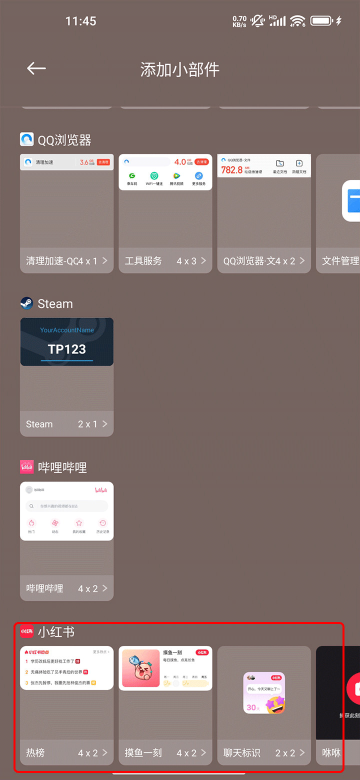 找到“小红书”的小组件,根据自己的需求来进行添加