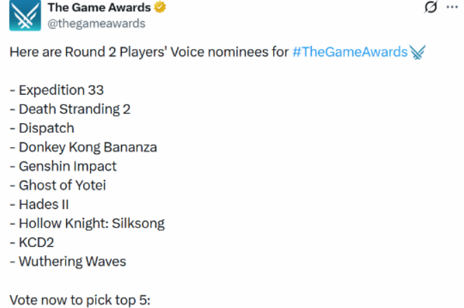 TGA宣布,玩家之声10强名单公布,第二轮投票现已开启,票数最高的5款游戏将进入第三轮投票。名单如下:
