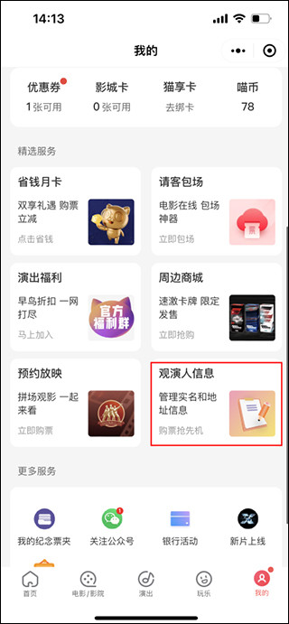 进入到个人中心页面,向下滑动屏幕找到并点击“观演人信息”选项;