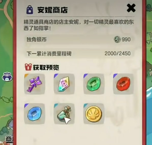 然后是彼得大道那边,这里也有个精灵道具店。具体位置在彼得大道区域,打开地图就能找到。这个店铺的模式和安妮商店差不多,同样有消费里程碑这个设定。完成了对应的消费额度就可以领取奖励,粉尘自然也包含在内。而且这个店里直接购买魔法粉尘的价格也还算合理,急用的时候可以直接买一波。