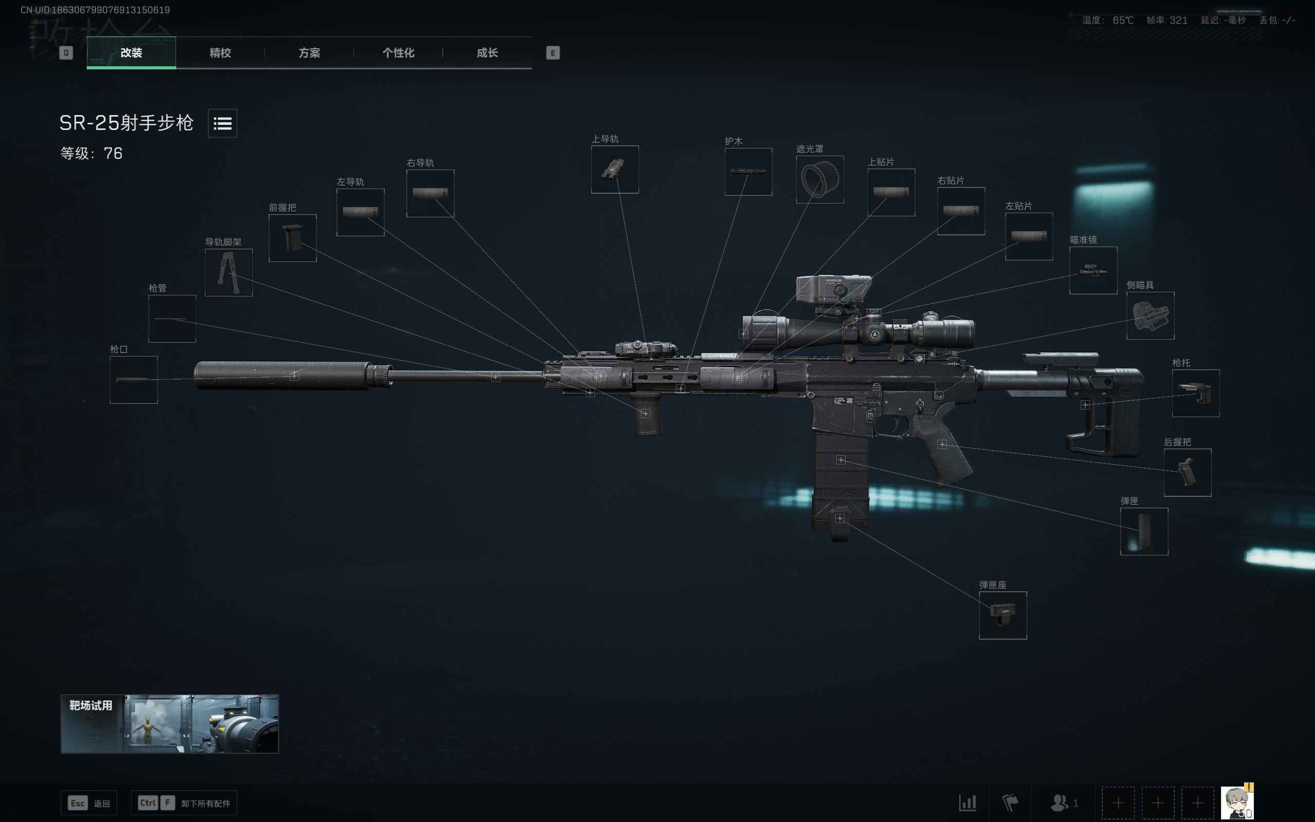 AR MOE后握把、SR25新星超长枪管、共鸣狙击枪消音器、骨架狙击枪托、SR25精英护木、相位战斗前握把、DBAL-X2紫色激光镭指、游侠护木片*5、SR25 30发扩容弹匣、灰熊全威力口径快拔套(黑)、灵眼3/7弹道计算狙击镜。