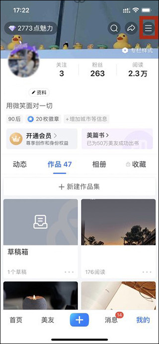 在美篇app的主界面上选择我的,点击“三杆”菜单图标;