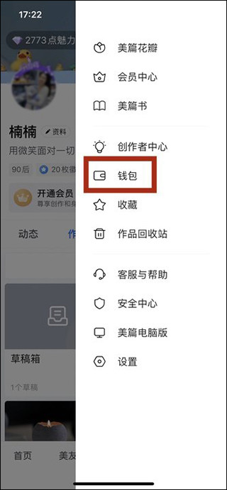 紧接着点击弹出的菜单宿摸中的“钱包”选项;