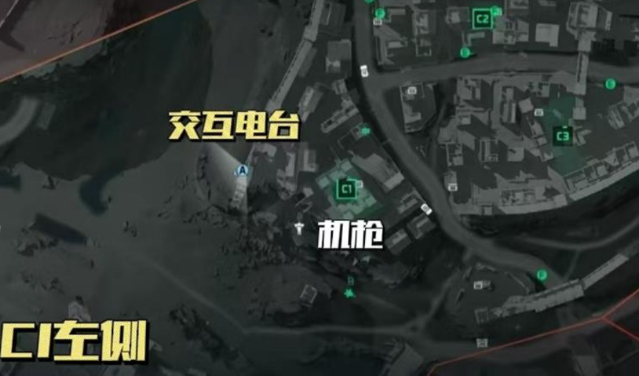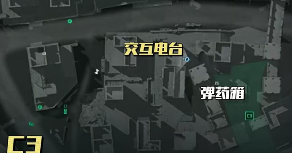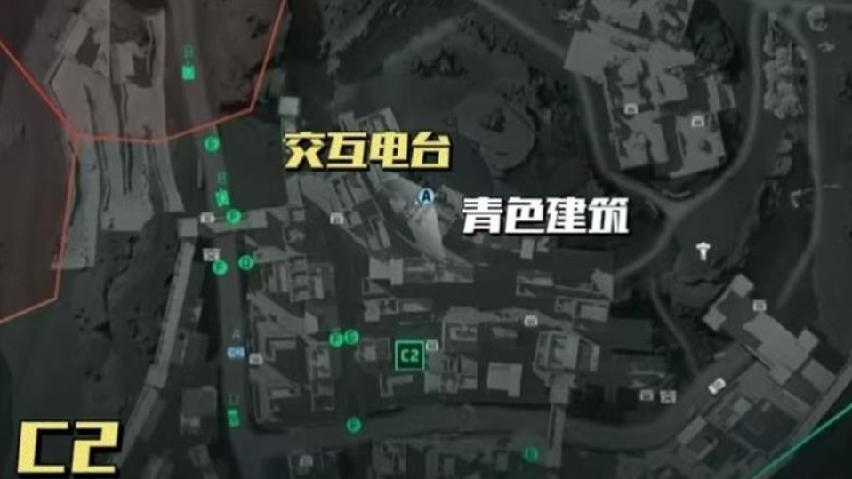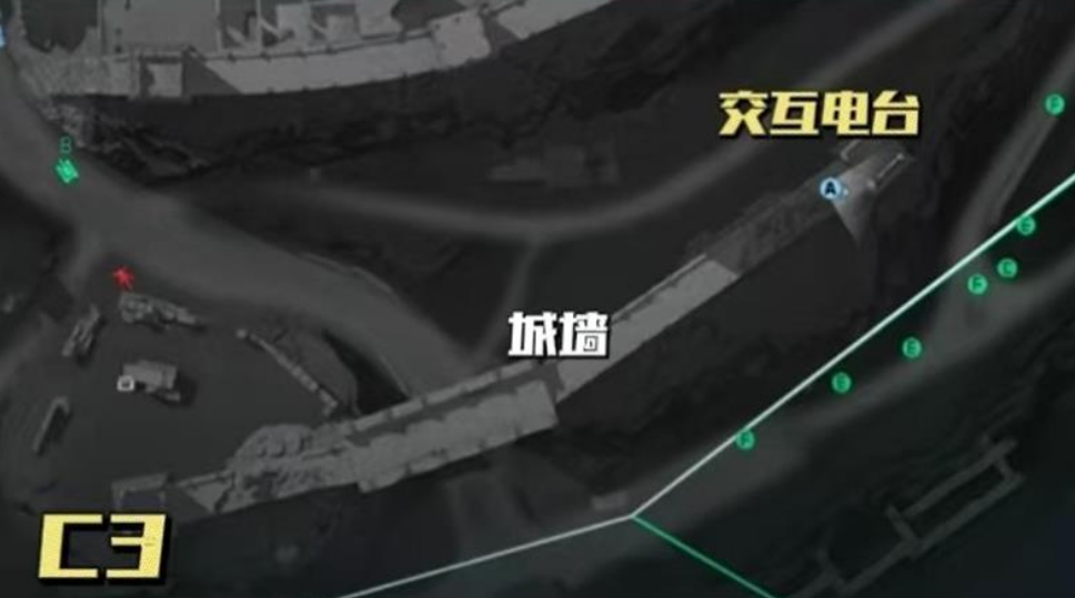 C2上方的电台处在C区与E区交界处,标志物为一座显眼的青绿色房屋。靠近该建筑后,从其左侧山坡攀爬而上,在屋檐与坡地连接的角落位置就能找到目标电台。C3右下方的电台则位于城墙尽头,沿着墙体一路前行,最终会在一座倒塌的高塔前看到设备。此外,C3重生点附近也有一个电台,需跳上箱子进入破碎墙体,再攀至屋顶的小门前,电台就在门边,虽然途中会提示脱离战场,但不影响交互。