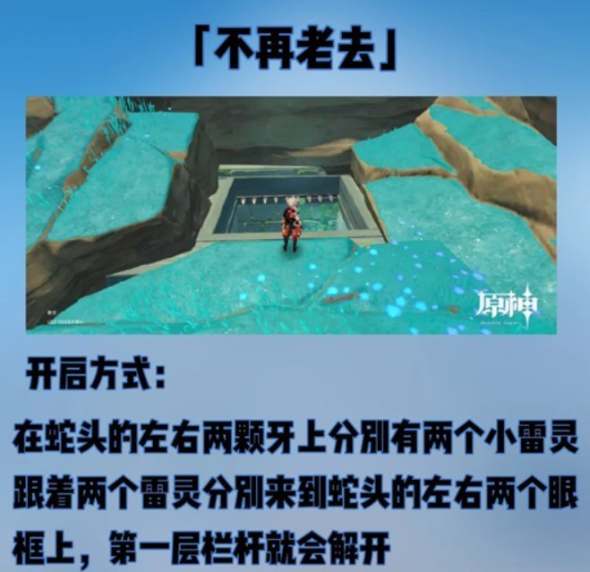 •在蛇头的左右两颗牙上分别有两个小雷灵,跟着两个雷灵分别来到蛇头的左右两个眼框上,第一层栏杆就会解开