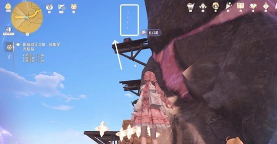 跟着噗灵指引,贴着粉色晶体石壁走。风车上有四颗,然后跟着噗灵到起点的方向,面向大喷泉飞过去到达终点。