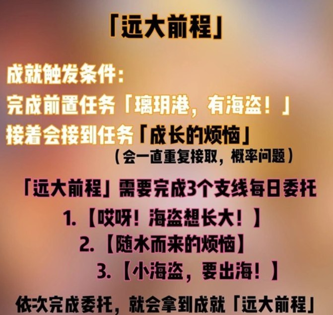 ⓷ 拿到成就【远大前程】后,概率接到后续委托【小小的远行】系列委托,有三条分支,无成就。