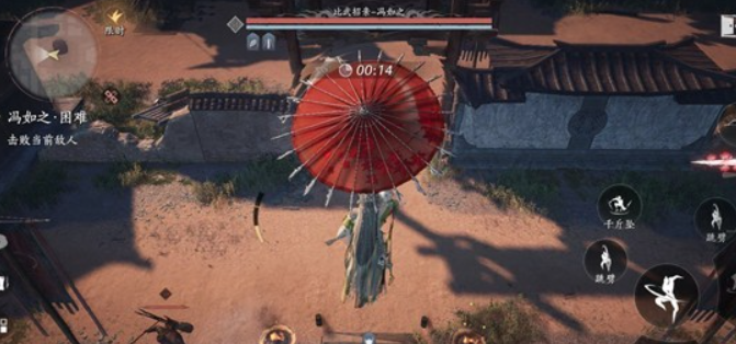把BOSS引出擂台后。先上门槛再三段跳上柱头,或者先三段跳上到横柱上(有失败概率),再上柱头用陌刀特殊技刮,要注意卸势四次水刀,BOSS会先举刀。