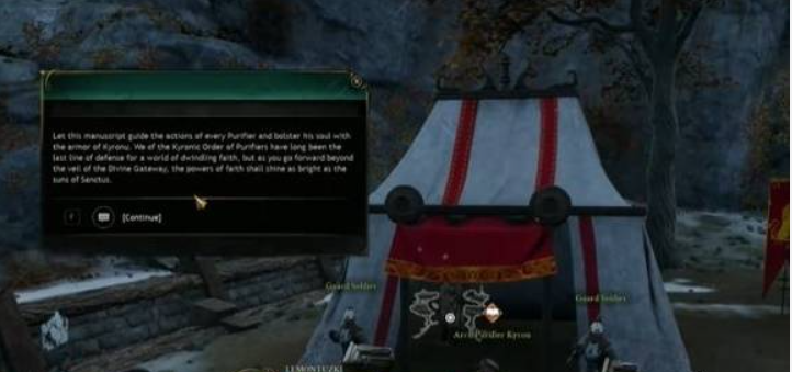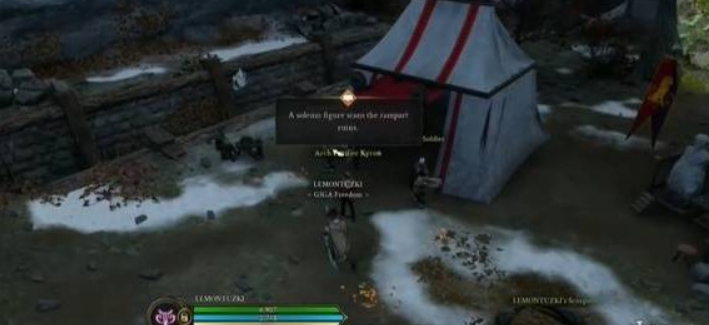 对话结束,找到如图所示的NPC并与之对话,他让我们进入后面的帐篷中对话。