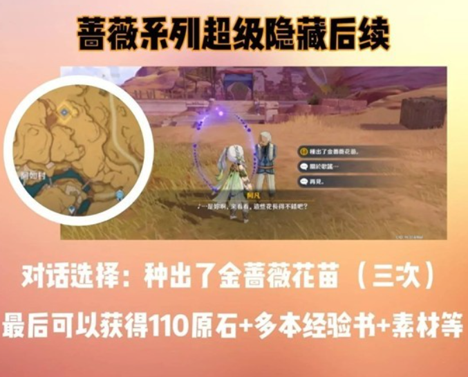 对话选择:种出了金蔷薇花苗 (共对话三次),最后获得110原石,经验书,锻造素材等等..