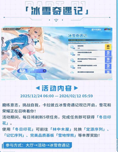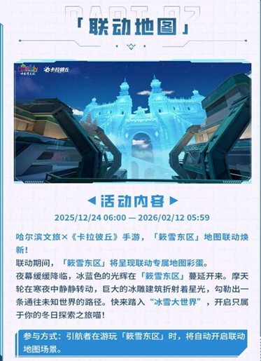 《卡拉彼丘》手游与哈尔滨文旅今日正式推出限时联动活动冰雪奇遇记,本次活动将持续至2026年2月12日05:59,共计35天17小时,让玩家们能够拥有足够的时间体验这一次的活动!以下是小编为玩家们准备的详细资讯内容,感兴趣的玩家们快来一起看看吧!