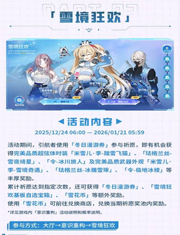 玩家使用“冬日漫游券”参与祈愿,有机会获得包括“米雪儿·李-踏雪飞猫”、“珐格兰丝-雪夜绮星”、“令-冰川旅人”及完美品质武器外观“米雪儿·李-雪境奇遇”、“珐格兰丝-冰雕雪琢”、“令-极地冰棱”等丰厚奖励。累计祈愿达到指定次数,还可获得额外奖励。