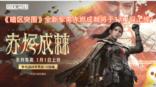 《暗区突围》手游官方正式宣布“赤烬成棘”系列军需将于1月1日正式上架!玩家们只要在当天上线即送10连抽,让你每一次抽奖都有机会获得稀有金装!以下是小编为玩家们准备的详细资讯内容,有兴趣的玩家们快来一起看看吧!