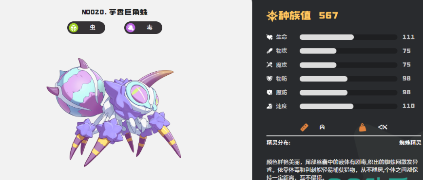 芋香巨角蛛负责持续毒伤与战术压制:当敌方使用低能耗技能时,自动施加中毒状态。技能搭配首选【以毒攻毒】(中毒目标存在时,自身攻击力逐层提升)、【毒液渗透】(魔法伤害+毒素叠加)、【防御】(高额减伤)及【扬沙】(稳定物理输出),形成“耗能—中毒—增伤”的闭环压制链。