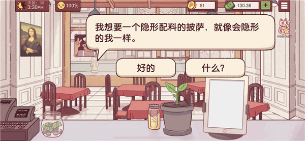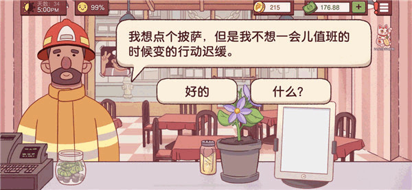 3、有一个粉色头发头上有颗草的姐姐要用特殊礼物换免费披萨。点“是"给她做什么都可以。我做的是酱料+芝士+意大利辣肠。送了一个花盆,可以种出来茄子。