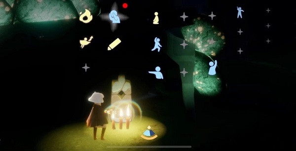 找到石碑前的人影可以打开先祖商店。在先祖商店中我们可以用蜡烛解锁姿势或祝福,用爱心购买新的装扮,还可以购买乐器与好友合奏。
