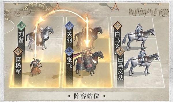 需要让关羽踩到刘备、张飞二位的追击格,以最大化关羽的输出;刘备的另一个追击格可考虑上阵有着不错词条和属性的弓兵、术士,往往也能打出不俗的输出。