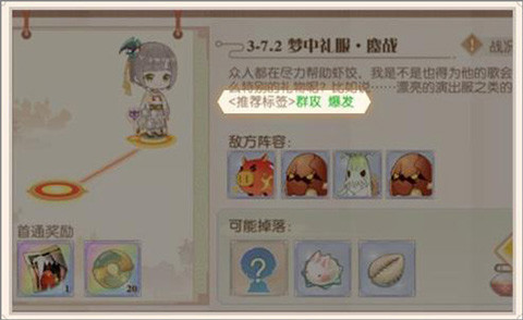 我们可以看到关卡3-7推荐标签为<群攻>爆发>,那么我们可以选择有这两种标签的食魂,如:一品锅、鸡茸金丝笋、驴打滚、松鼠鳜鱼等