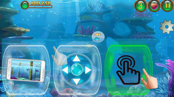 2、慢慢的我们越来越多,通过选择三种移动按键来操作小鱼越来越大。