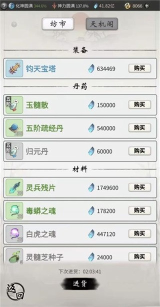 经过老板娘芸娘的潜心经营,此坊市如今是清虚观内最大的坊市。从装备到丹药,坊市里应有尽有。若哪天走运,还能遇到稀有的材料,买到即赚到呀。