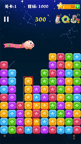 2、如图所示只要是颜色一样的星星连在一起我们就可以点击消除;