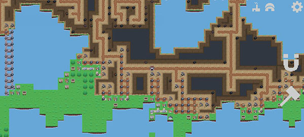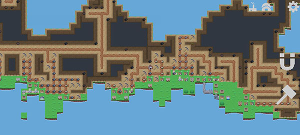 这里插播一下矿区的布局思路:先开图,挖隧道进山区,碰到矿就绕开,不要用路占矿,等图开的差不多了,再看矿的布局来考虑铁矿铜矿和煤矿的分布,尽量找靠的最近的金属矿和煤凑一对,导出到平原的物资尽量合成到最高状态,能直接合成到实验材料就不要转移到主岛上去,直接合成再开快递转移(毕竟快递车也是越来越贵的)如果海边的矿,也可以像我这样搭桥过河传