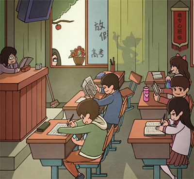2、穿蓝色衣服的男生,书本里夹着一本漫画书,点击漫画书就可以了。