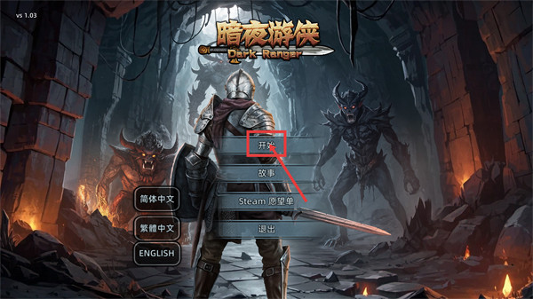 1、进入【暗夜游侠-Dark-Ranger】界面后,先选语言(如简体中文),再点击【开始】按钮,即可进入游戏流程。