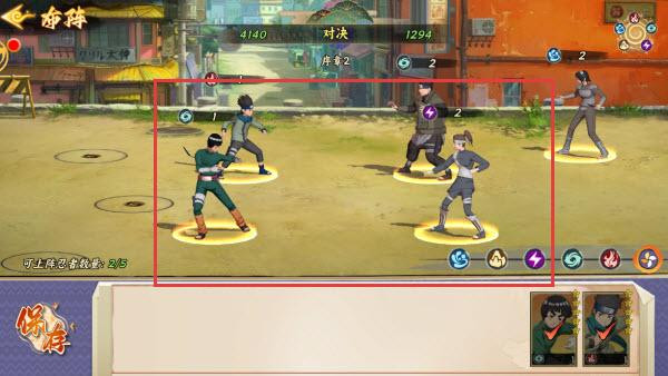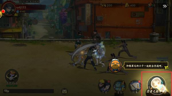 1、进入战斗场景,操控角色,利用技能按钮释放招式,与队友配合,击败敌方忍者,获取战斗经验与资源。