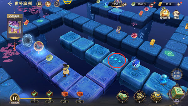 世外瀛洲玩法可谓是步步有机关,步步有惊喜。少侠们可使用机关骰子,来确定前行的方向与步数,从而获得各种奖励,甚至还有可能触发特殊事件,开启隐藏挑战。大有一种“虽不知前路,但一往直前”的气魄。而且世外瀛洲中还能设定心愿英雄,让大家能多一个与秦时角色互动的机会。
