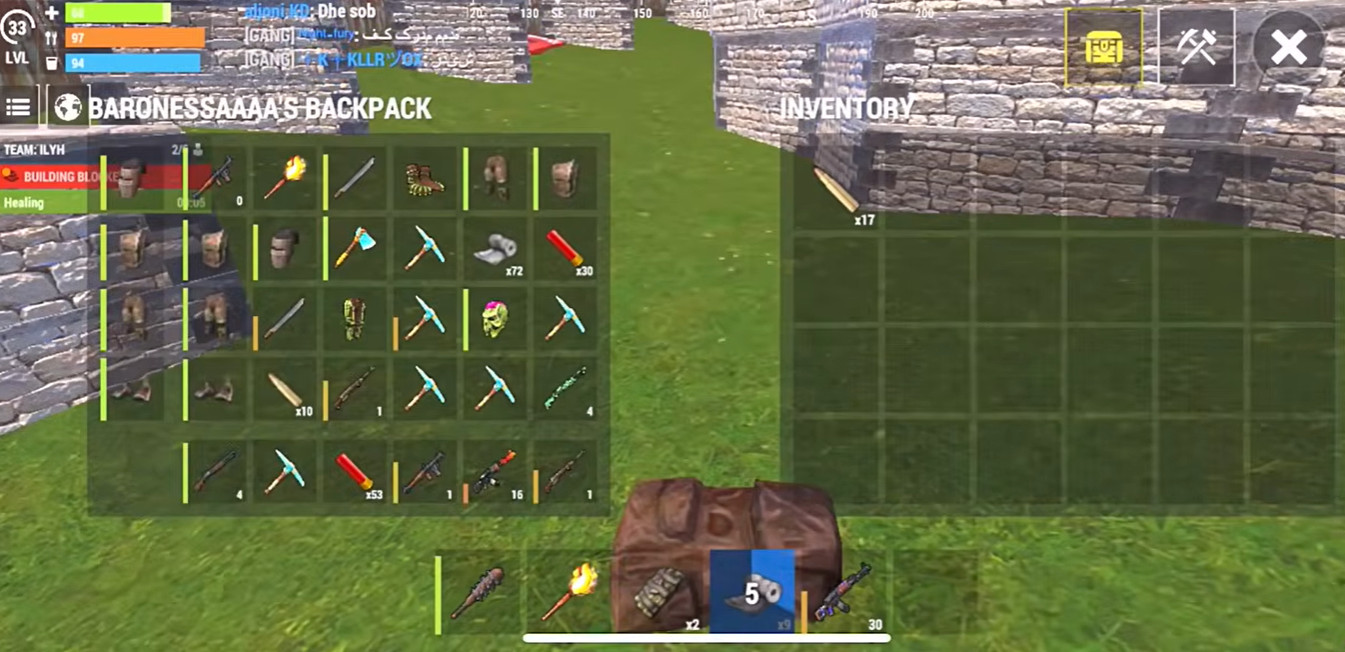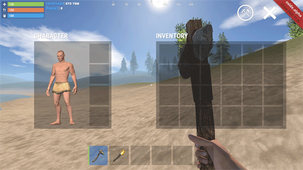 2、点击右上角背包可以打开背包,同时可以查看制造和可制造列表,以及你的穿装信息,我们可以用手指拖动将背包里的东西拖到屏幕正下方的腰带上,点击不同的物品来切换腰带上的激活物品,以便使用物品。