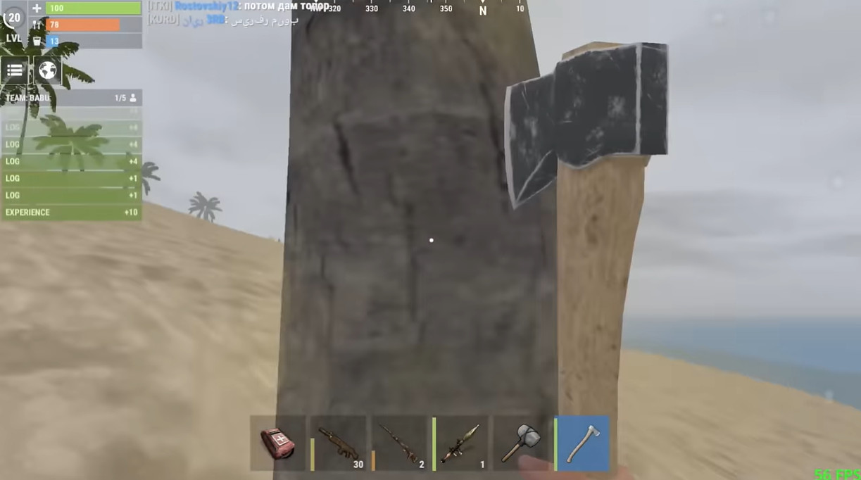 7、先不要急着造家,因为每个服务器的地图都是随机生成的,所以一开始,我们应该到处走走,找物资刷新点(大铁球,工厂,核电厂,卫星雷达,峡谷等),随机看运气,看看会碰到什么辐射区,比如我就走到了大铁球,找到辐射区之后,立即拿你的石头去砍树10下,采集100木头,然后捡地上身上的“麻类纤维”,采集30个布,然后打开背包制作一个睡袋,放到快捷栏。