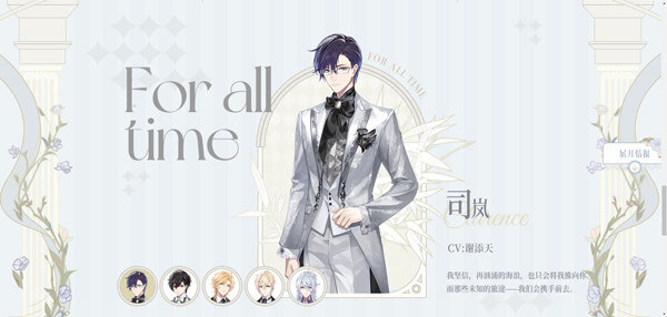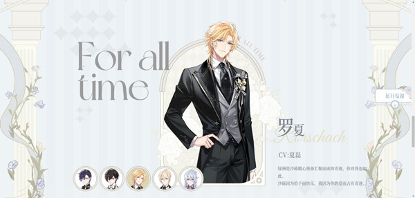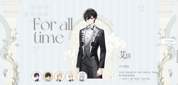 多时空恋爱冒险手游《时空中的绘旅人》男主角之一,年龄20岁,身高181cm,双鱼座,生日3月19日,由赵路(中),花慎之介(日)配音。在现代世界的身份是圣塞西尔学院天文系的转校生。在平行世界叶塞大陆的身份是法师塔【九席】高阶法师。在乐园世界的身份是乐园主人。在灵界的身份是森之灵。