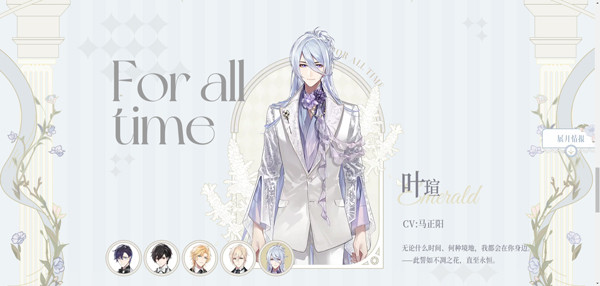 多时空恋爱冒险手游《时空中的绘旅人》男主角之一,年龄未知,身高183cm,摩羯座,生日12月31日,由姜广涛(中)、平川大辅(日)配音。在现代世界的身份是圣塞西尔美术系导师,女主母亲过世后负责抚养女主长大。在叶赛大陆的身份是反抗军领袖白银骑士,本身是千之帝国的军官白银提督。与另外四位男主不同,叶瑄拥有与女主(玩家)相同的能力,也是一位极其罕见的【旅者】,能够自由地穿梭时空,是平行时空唯一个体。